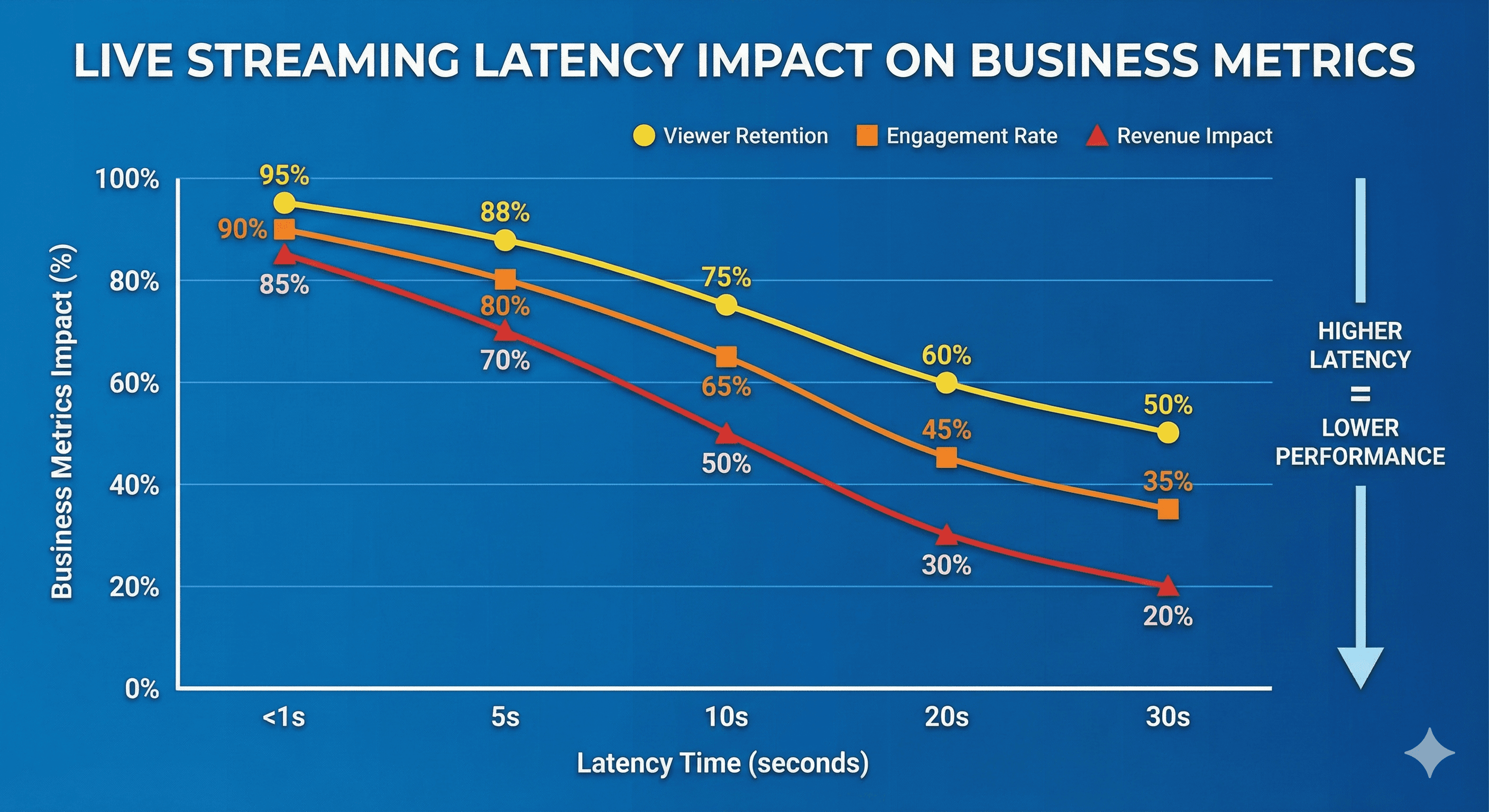 AI Prompt: "Create a professional business impact chart showing the relationship between live streaming latency and business performance. X-axis: latency time from <1s to 30s. Y-axis: percentage impact on viewer retention, engagement rate, and revenue. Use declining curve graphs in different colors (red for revenue impact, orange for engagement, yellow for retention). Include data point markers and percentage annotations. Corporate blue theme, clean data visualization style, suitable for B2B presentation"