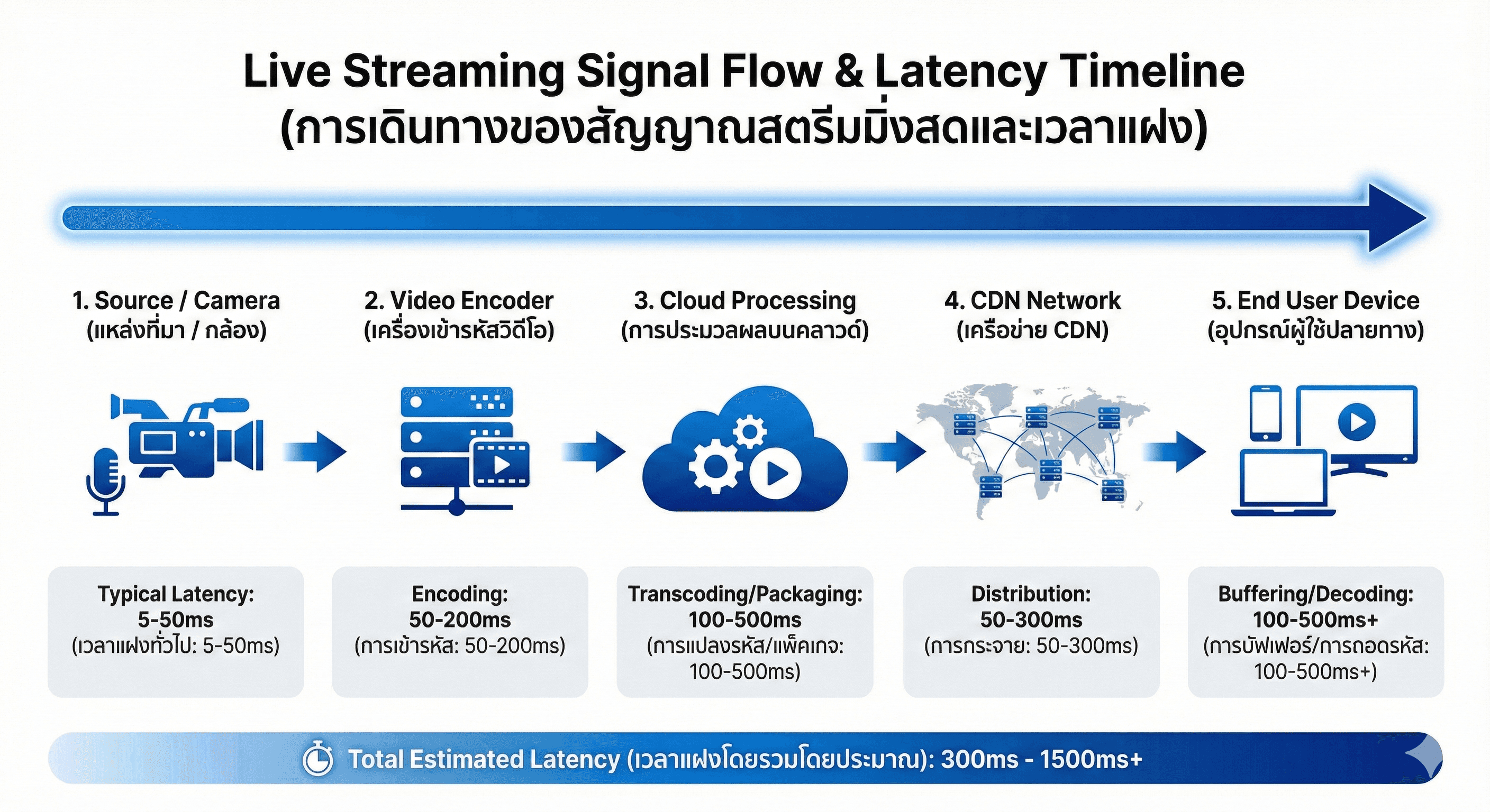 Suggested Visual: Timeline infographic แสดงการเดินทางของ video signal จาก camera → encoder → CDN → viewer พร้อมแสดงจุดที่เกิด latency ในแต่ละขั้นตอน