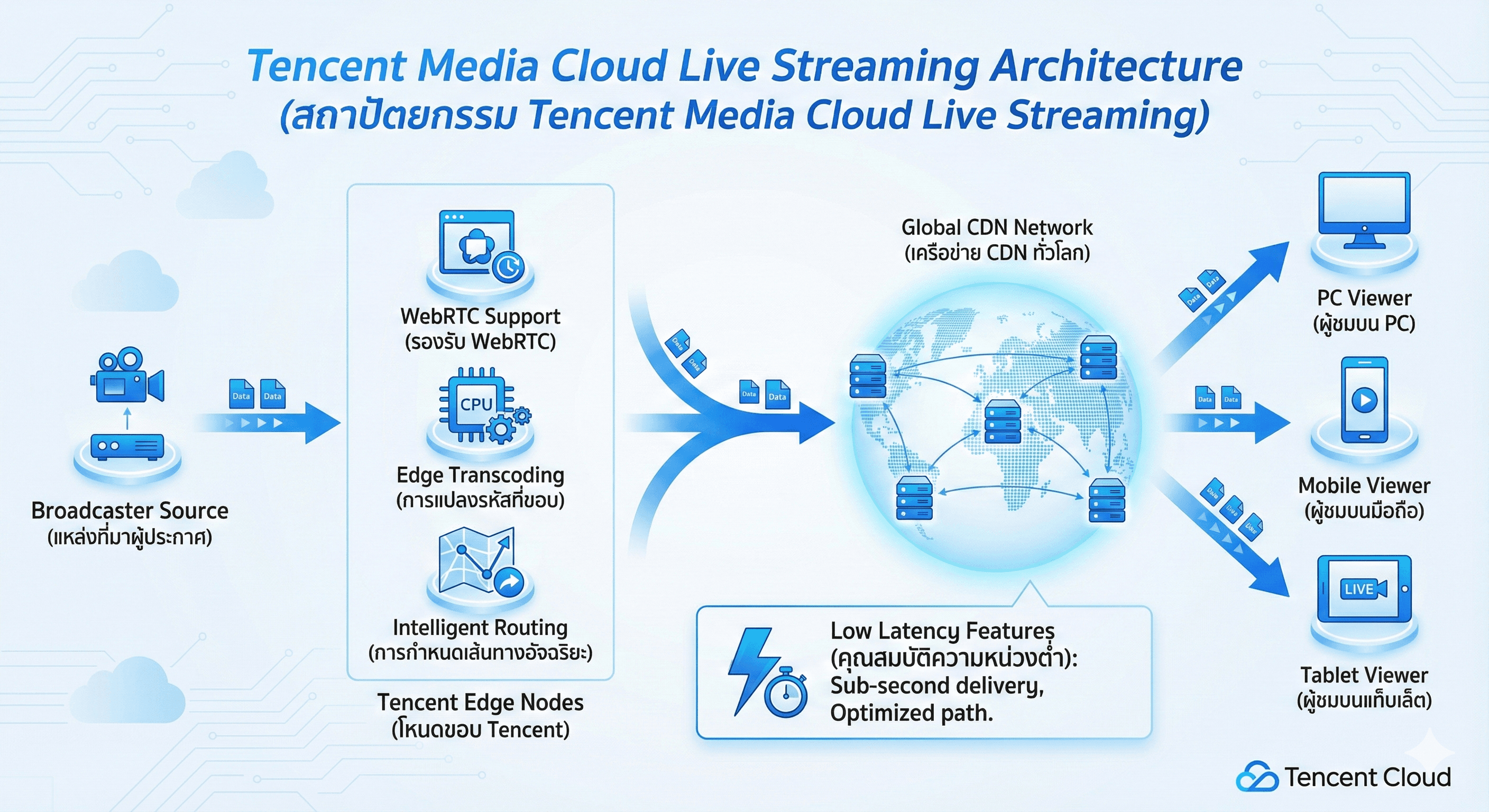 AI Prompt: "Create a technical architecture diagram showing Tencent Media Cloud live streaming infrastructure. Include: broadcaster source → Tencent edge nodes → global CDN network → viewers on multiple devices. Highlight low latency features with icons: WebRTC support, edge transcoding, intelligent routing. Use Tencent brand colors (blue theme), cloud technology aesthetic, professional network diagram style, clean and modern B2B presentation quality, minimal Thai labels for key components"