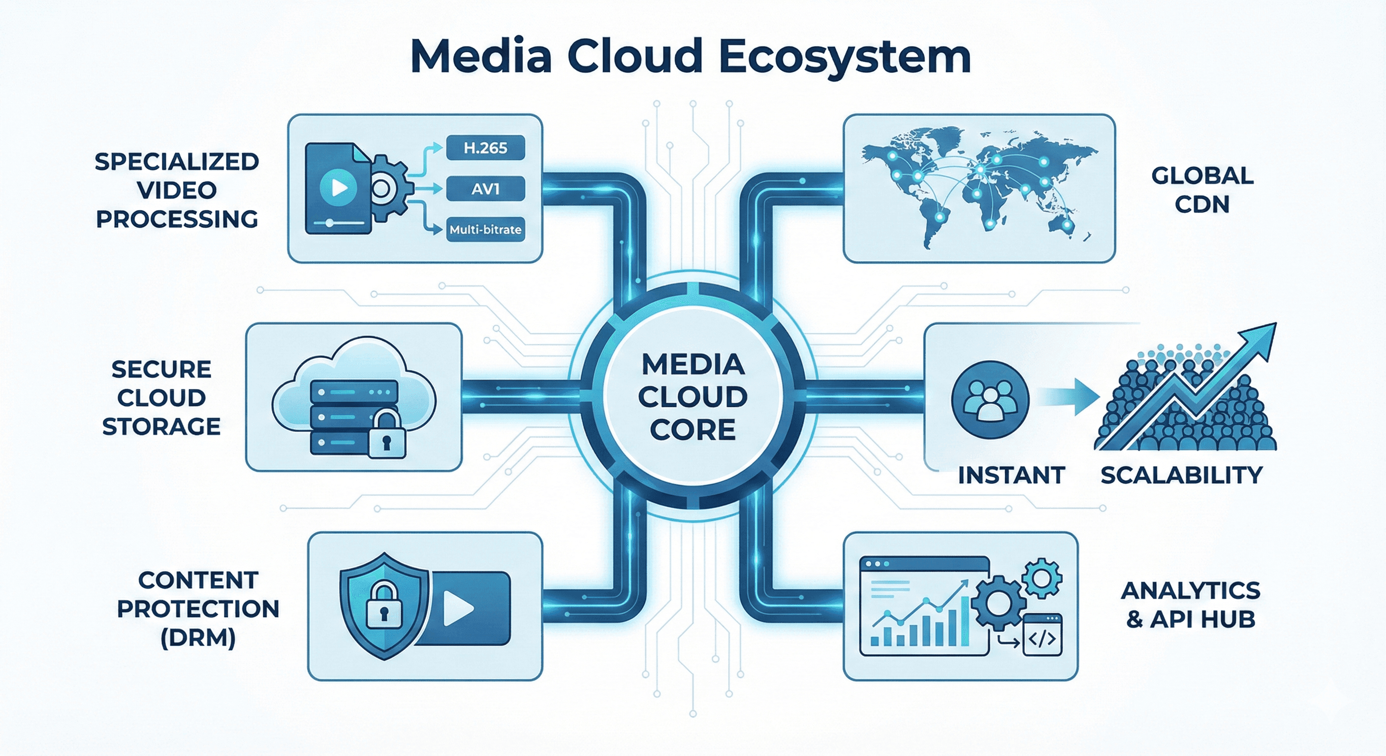องค์ประกอบสำคัญที่ทำให้ Media Cloud ต่างจาก Cloud ทั่วไป ได้แก่: