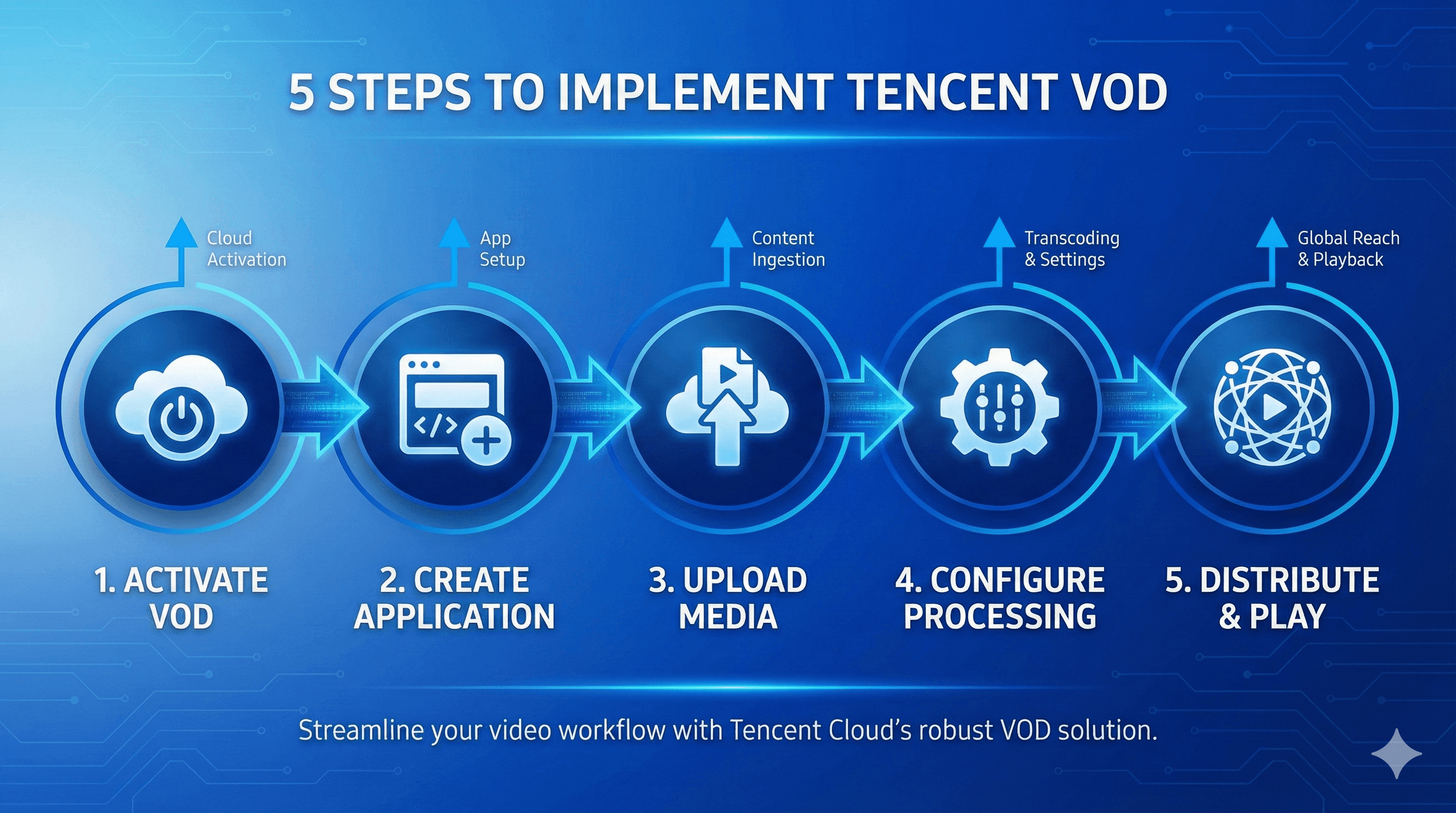 AI Prompt: "Create a horizontal timeline infographic showing 5 steps to implement Tencent VOD: Step 1 (Activate VOD - cloud activation icon), Step 2 (Create Application - application icon), Step 3 (Upload Media - upload arrow icon), Step 4 (Configure Processing - gear settings icon), Step 5 (Distribute & Play - global distribution icon). Connect steps with arrows. Use blue gradient. Modern tech style with icons."
