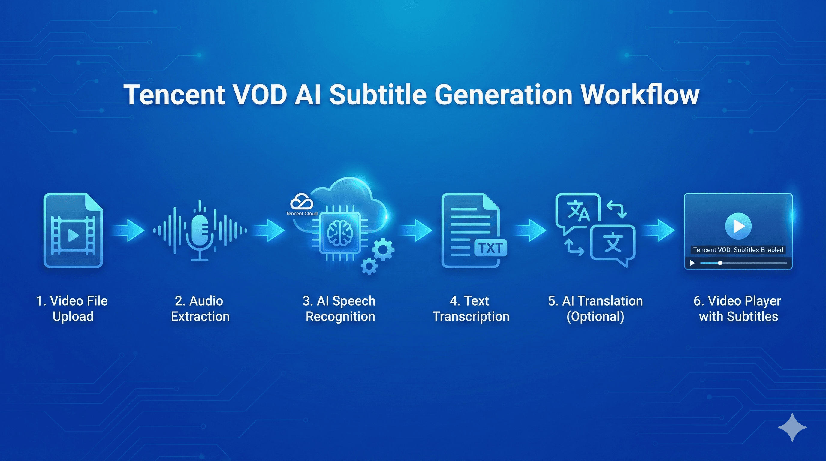 AI Prompt for Infographic: "Create a horizontal process infographic showing Tencent VOD's AI subtitle generation workflow. Include icons for: video file, audio waveform, AI processing, text document, translation, and video player with subtitles. Use a modern, tech-focused design with blue gradient."