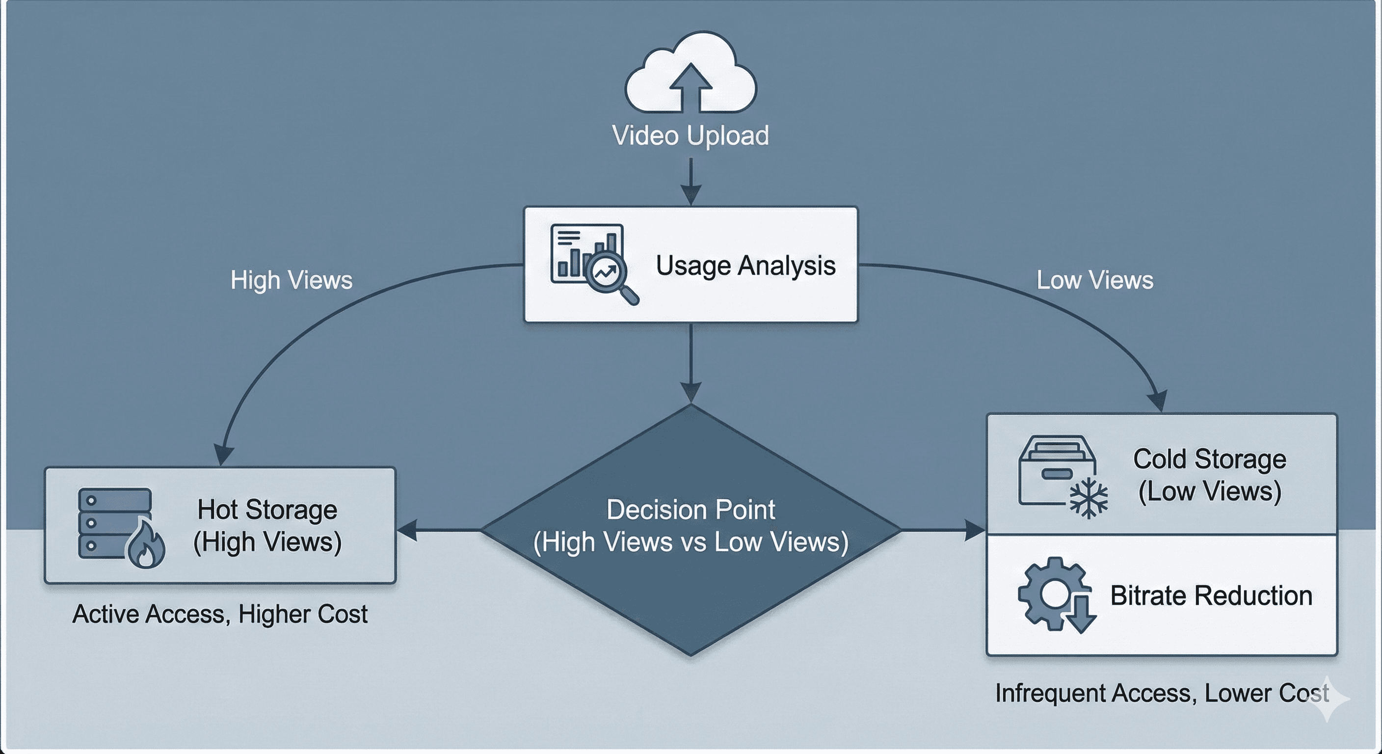 AI Prompt for Graphic Designer: "Create a flowchart diagram showing video lifecycle in Tencent VOD's cost management system. Show: Video Upload → Usage Analysis → Decision Point (High Views vs Low Views) → High Views stays in Hot Storage → Low Views moves to Cold Storage + Bitrate Reduction. Use icons for storage tiers and analytics. Professional blue-grey color scheme."