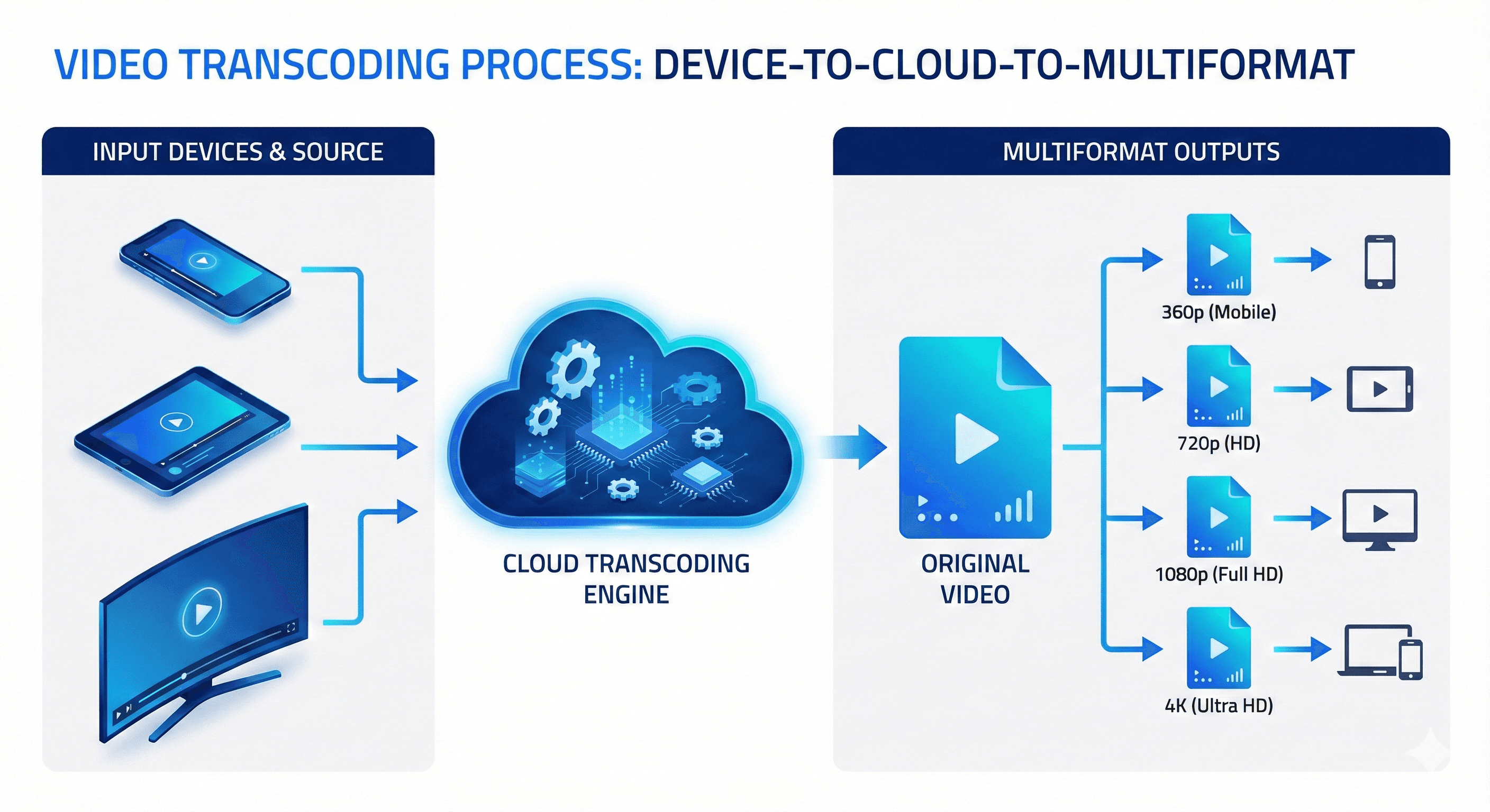 Video Transcoding คือ กระบวนการแปลงไฟล์วิดีโอจากรูปแบบหนึ่ง (Codec/Format) ไปเป็นอีกรูปแบบหนึ่ง เพื่อให้เหมาะสมกับการนำไปใช้งานใน อุปกรณ์หรือความเร็วอินเทอร์เน็ตที่แตกต่างกัน