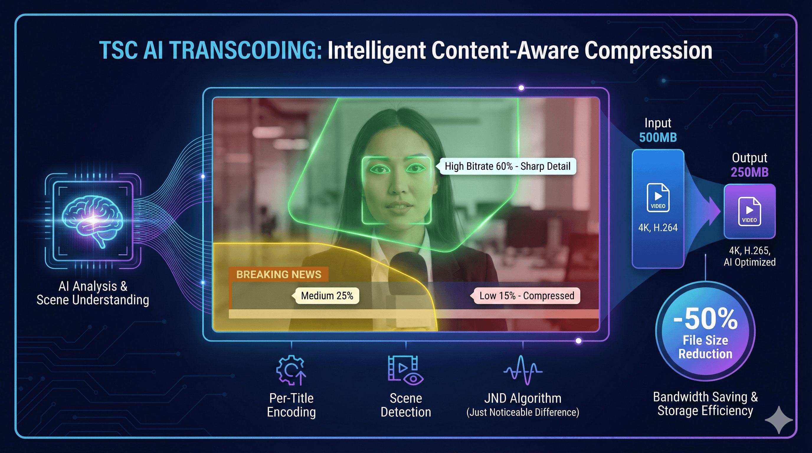 เทคโนโลยี AI-Driven Transcoding ที่เป็นลิขสิทธิ์เฉพาะของ Tencent Cloud (หรือเรียกว่า Top Speed Codec หรือ Smart Coding) Tencent TSC ใช้ AI วิเคราะห์เนื้อหาในวิดีโอแบบ Scene-by-Scene หรือ Frame-by-Frame ด้วยเทคนิค Per-Title Encoding ผสมกับ AI Scene Recognition ซึ่งลดขนาดไฟล์/Bitrate ได้ 30% - 50% (เมื่อเทียบกับ General Transcoding)